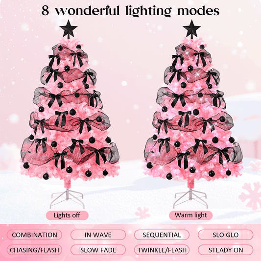 Sevenstars 6FT Pink Christmas Tree With Black Bows,Artificial Christmas Tree (With LED) For Decoration