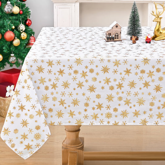Sevenstars Christmas Tablecloth Gold Snowflake Table Cloth White Rectangle Table Cover for Dinner Party, 60" x 84"