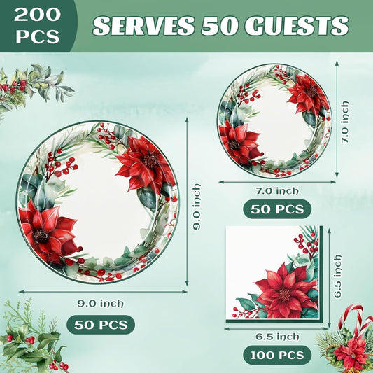 Waipfaru 200 PCS Christmas Paper Plates and Napkins Disposable, Christmas Poinsettia Printed Round Disposable Plates for Christmas Holiday Dinner Birthday Party Supplies