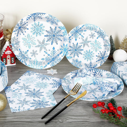 Waipfaru 200 PCS Christmas Party Supplies Disposable Plates Napkins Set,Blue Christmas Tableware Set Dinner Lunch Dessert Appetizer Decoration Xmas Party, Serve 50