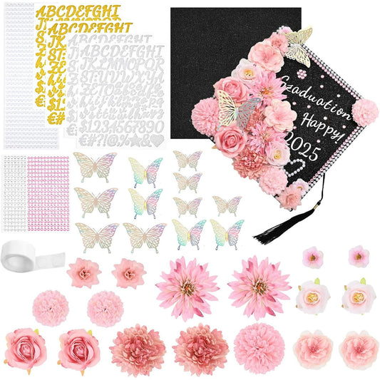 Waipfaru Blue Graduation Cap Decorations,DIY Grad Cap Kit Included Artificial Flower Heads 3D Butterfly Decoration Rhinestones Letter Stickers Glitter Paper for 2025 Graduation Cap Topper