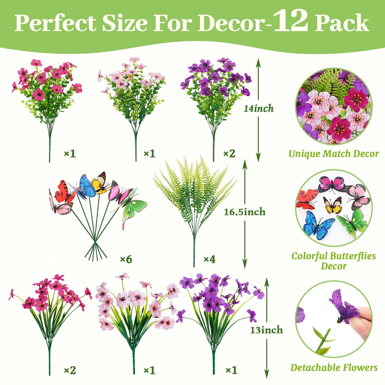 These fake outdoor plants are real looking, these artificial branches exude a stylish and authentic appearance, rendering them ideal decorations for your home, garden, yard, patio, balcony, both indoors and outdoors. Beautiful artificial outdoor plants are suitable for home, garden, porch, patio, window box, indoor and outside decorations. Brings beauty to your home. High quality silk material daisy flowers and plastic eucalyptus leaves. UV and all weather resistant. It will blooms all year round. Fake flowers are made of PE plastic(ECO-Friendly) and high-quality silk cloth,100% SAFE. Each flower come as close to real as can be, offer true-to-life petal and foliage textures. Honestly unless you stop and touch them people will think they're real,they even fooled the bees. If you live a busy life, and have no time to take care of real flowers. Try these 12 bundles of faux flowers! There are various vibrant colors to choose,no watering needed and adjustable branches make DIY easier. Create a bouquet style as you like,you can't believe you can also become a professional gardener! Plastic flowers are ideal for outdoor porches, walkway, terraces windox box, front yard, pots, hanging planters, gardens, landscape, windowsills, allow you have beautiful color all year around. Also suit for birthdays,weddings,memorial place or grave,they can live anywhere and have withstood heavy rain storms and winds.