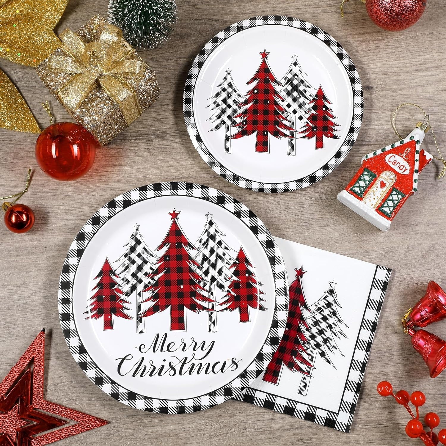 Are you hosting a Christmas theme party? Do you need some Christmas dinnerware for your guests? Waipfaru Christmas paper plates and napkins are a great choice. These Xmas paper plates and napkins are made of heavy-duty thick paper. It can hold most of the food. Our Christmas party supplies include 50 PCS 9 inch dinner plates, 50 PCS 7 inch dessert plates and 100 napkins. Enough to serve up to 50 guests at a Holiday party.The combination of a Christmas tree and Buffalo plaid is the perfect choice for disposable tableware in winter.It will bring a different visual experience to the guests on this special day at the Christmas party. These Christmas decorations are disposable,so you will not spend more time washing the plates. You can enjoy more time with your friends and family.