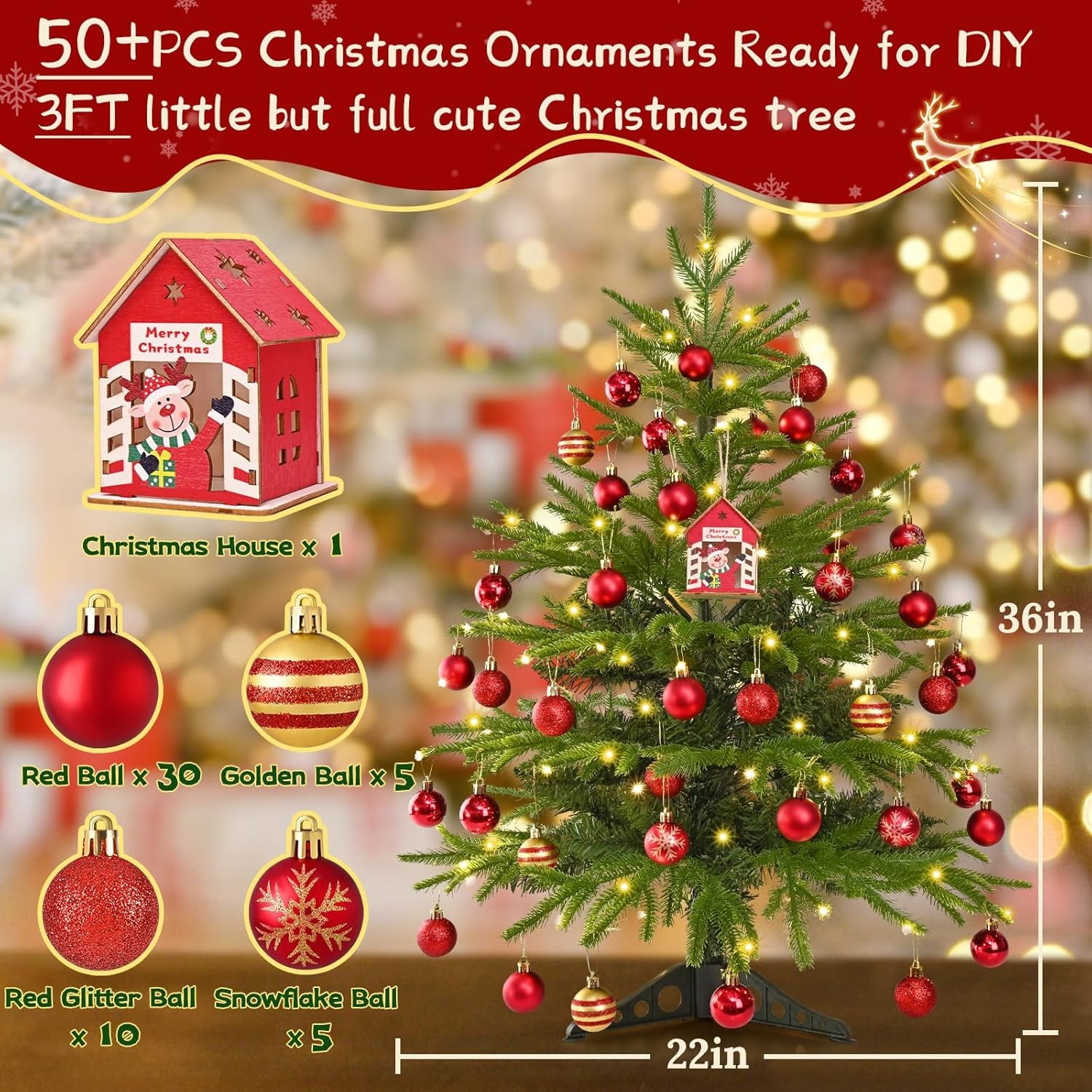 - Realistic & Full Appearance: Create a classic holiday centerpiece with this 3ft realistic artificial Christmas tree. Designed with dense, lifelike branches and natural green tones, it’s the perfect backdrop for your favorite Christmas decorations.Equipped with 51 Christmas ornaments, present a fuller appearance, offers the possibility of DIY for your decoration.