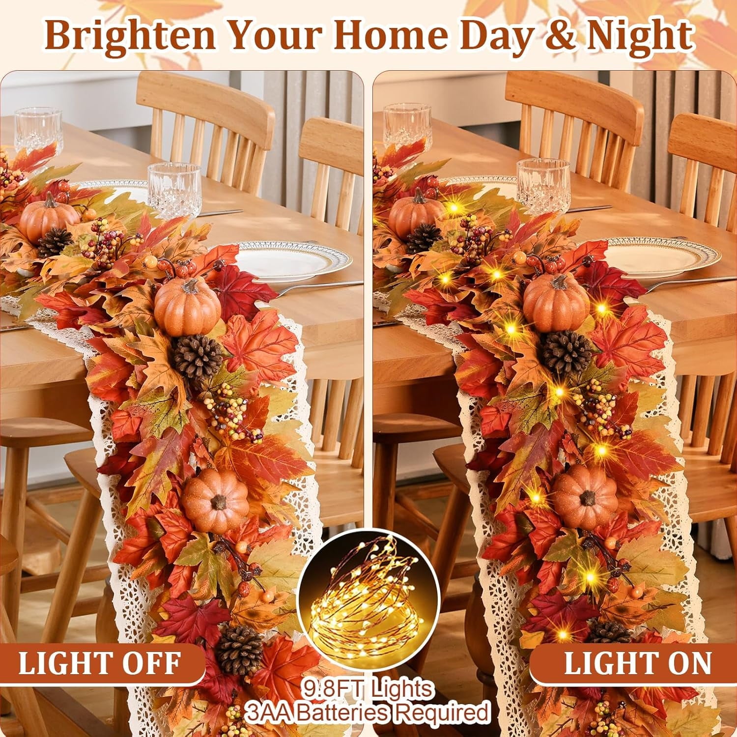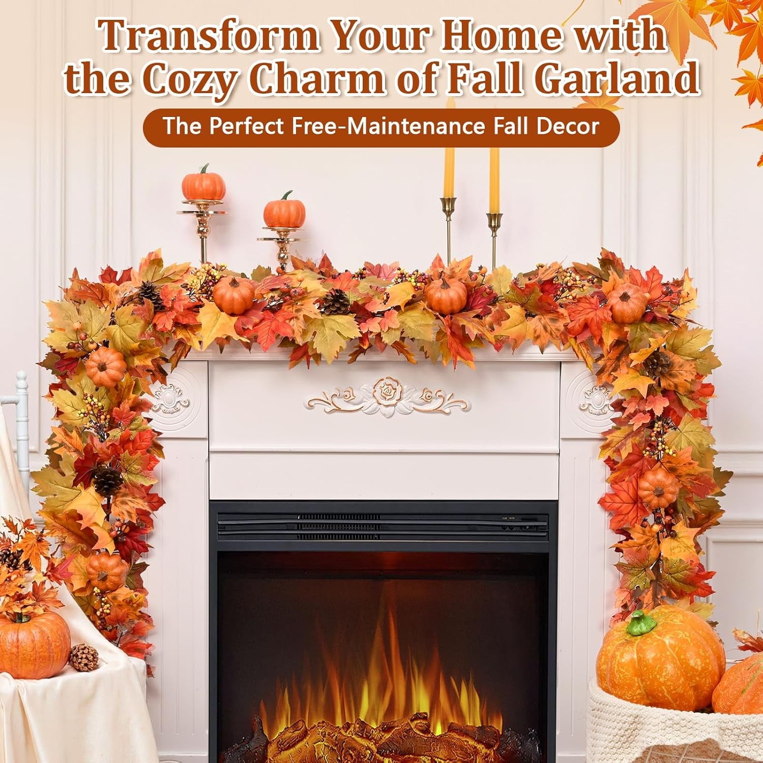 Instantly create a warm and inviting atmosphere with our beautiful Fall Decorations for Home. This timeless fall garland is generously packed with a rich tapestry of lifelike maple leaves, charming pumpkins, and berry clusters. As a beautiful fall garland with lights, it casts a soft, warm glow that brings the cozy spirit of the season indoors.Enjoy the magic without the hassle. Our Battery Operated Fall Garland features a convenient built-in timer, automatically lighting up each evening so you can set it once and forget it. This versatile Autumn Garland is the perfect fall garland for mantle, creating a stunning fireplace display. It also serves as a gorgeous table runner, making it one of your go-to Thanksgiving Decorations for welcoming family and friends.