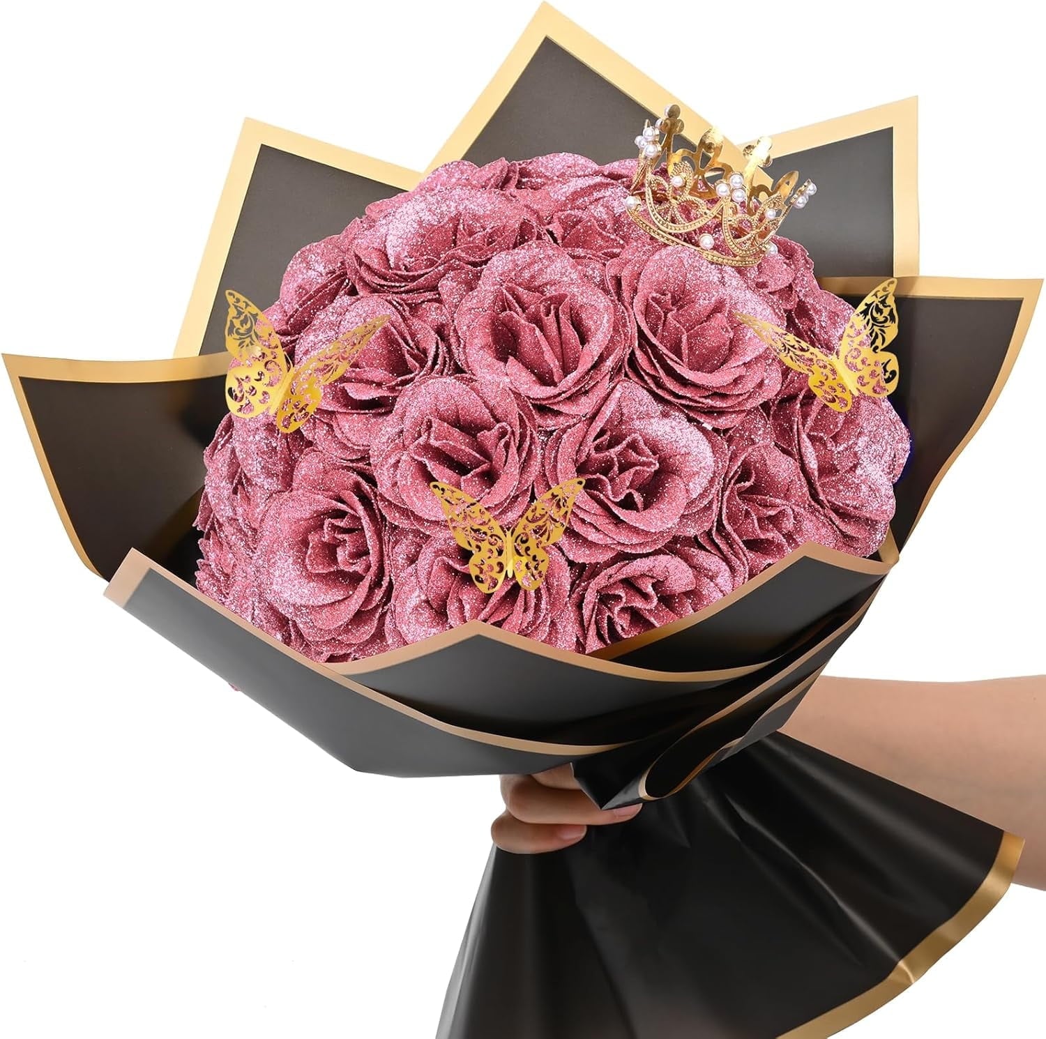 - DIY Glitter Roses:DIY glitter roses bouquet includes 36 glitter roses, stems, ribbons, wrapping papers, crown, and 6 butterflies.