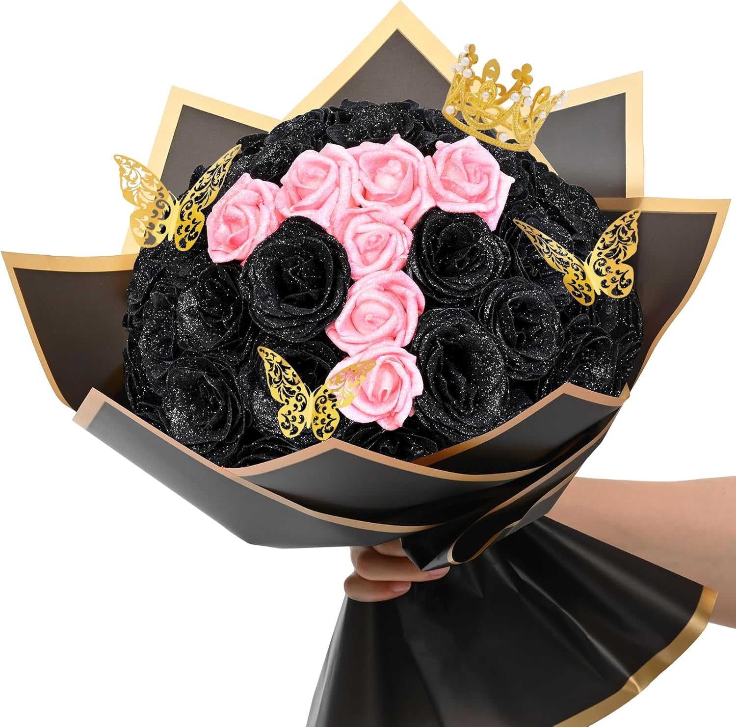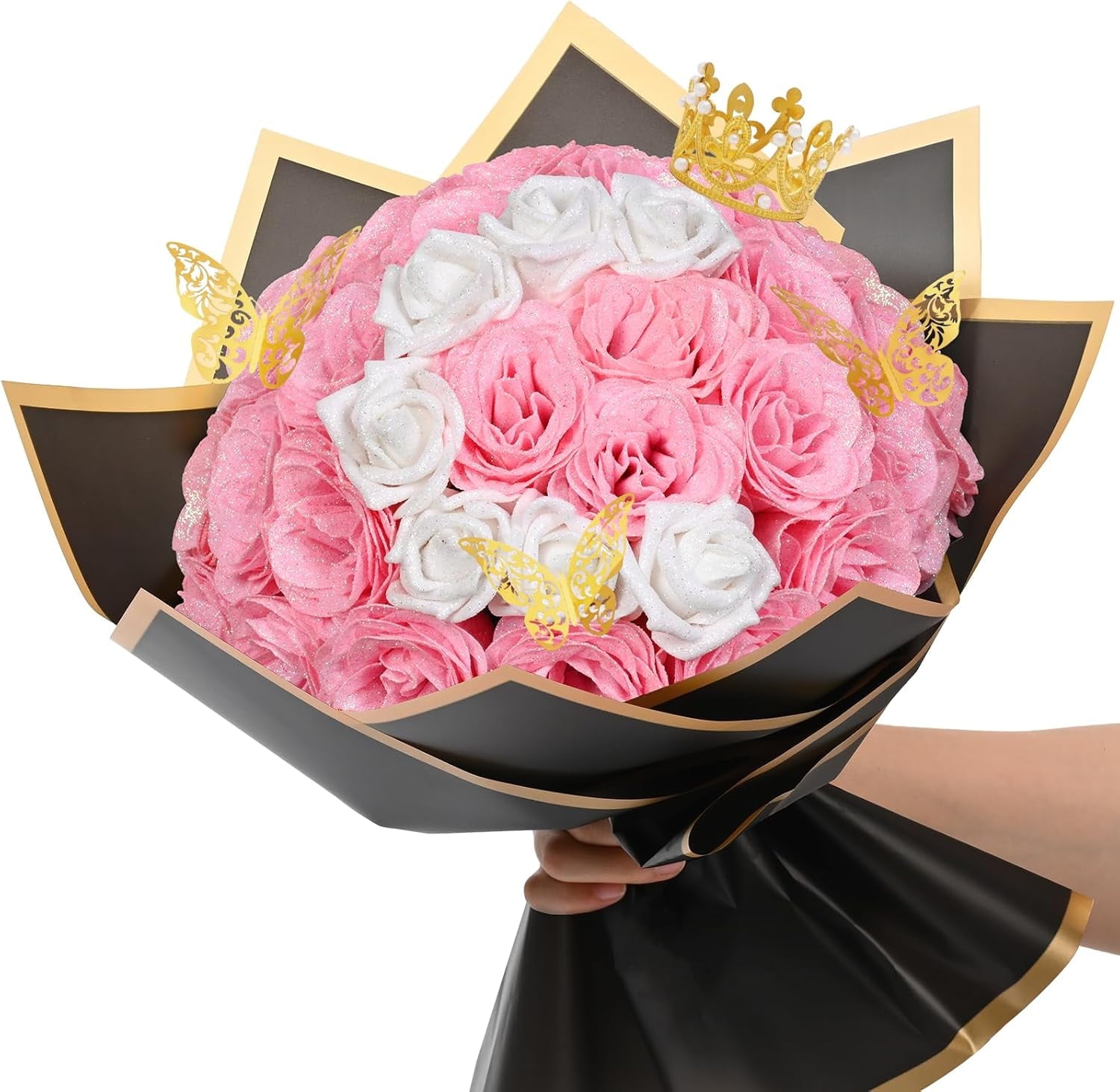 - DIY Glitter Roses:DIY glitter roses bouquet includes 36 red glitter roses, stems, ribbons, wrapping papers, crown, and 6 butterflies.