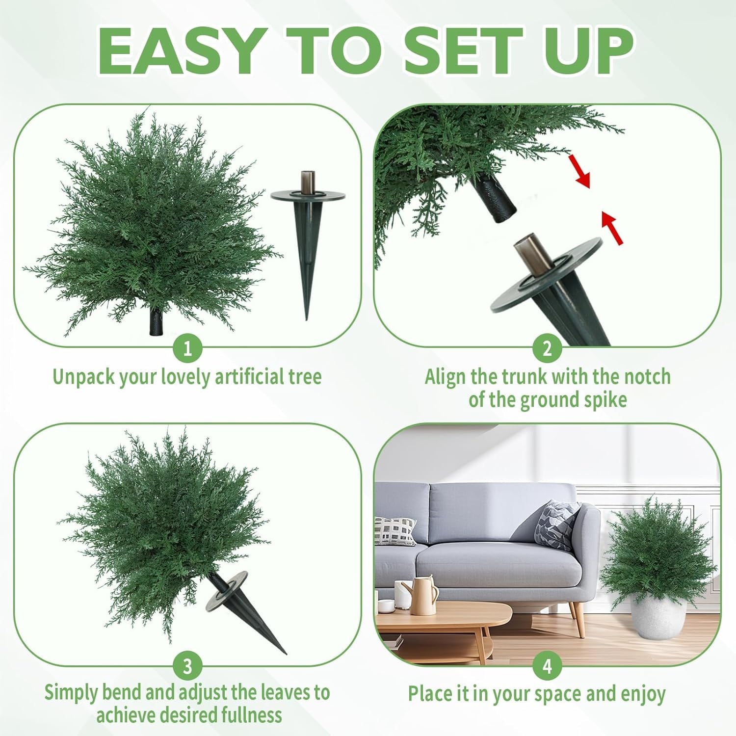 Bring year-round greenery to your home without the hassle of maintenance. These Artificial Shrubs are crafted to look like natural evergreens, making them the perfect Fake Plants Outdoor for your yard, garden, or porch. Designed with UV-resistant and weatherproof materials, these Outdoor Artificial Plants keep their rich color and shape through sun, wind, and rain.Each shrub comes with a sturdy stake, allowing you to easily secure them into garden beds, walkways, or decorative planters. Use them as Urn Fillers Outdoor or as Topiary Trees Artificial Outdoor accents to instantly elevate your curb appeal. Unlike real plants, these Faux Plants Outdoor require no watering, trimming, or replacement—just set them up and enjoy lush, natural-looking greenery.Perfect for homeowners, renters, and event decorators, these versatile shrubs also make an excellent Artificial Cedar Tree alternative. Whether you’re refreshing your front porch, adding charm to your patio, or designing an elegant landscape, these durable Outdoor Artificial Plants provide effortless style and long-lasting beauty.